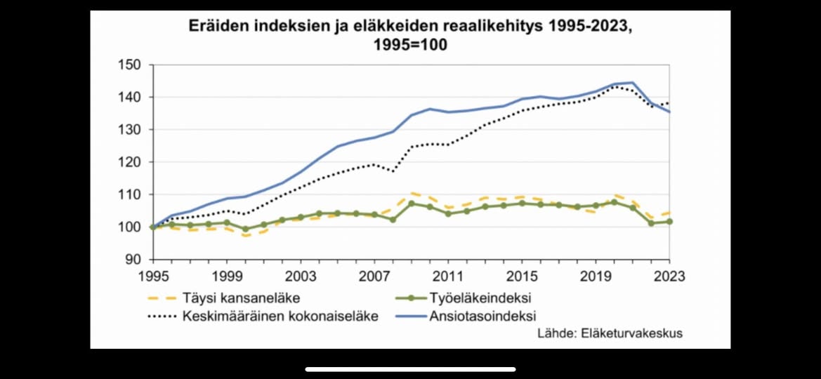 Eläkkeet ovat kehittyneet huonosti viimeiset 30 vuotta, reaalisesti vain 1 prosentin verran. Vuonna 1996 tuli voimaan taitettu indeksi ja se on puuttunut kovaa eläkkeiden kehittymiseen. Ennen 1996, oli voimassa ns.puoliväli-indeksi, eli eläkkeet kehittyivät 50% palkkaindeksin mukaan ja 50% kuluttajaindeksin mukaan. Taitettu indeksi on 20% palkkaindeksiä ja 80% . Vuoden 2027 alusta tulee vielä voimaan yksi leikkuri, eli taitettu indeksi on voimassa mutta jos kuluttajahintaindeksi on korkea, eläkkeitä ei koroteta enemmän kun mitä palkat kehittyy